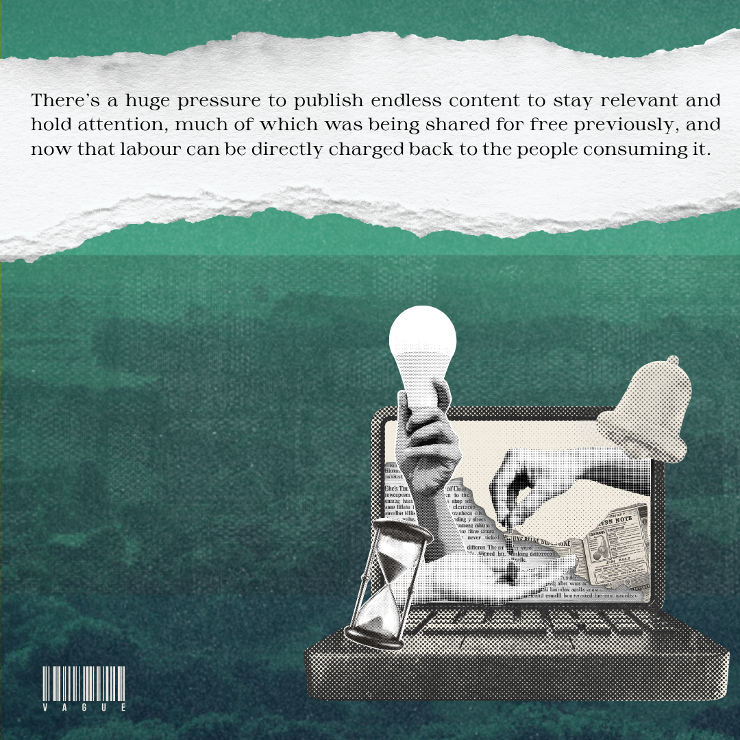 Instead, we should pay attention to the recent shift, especially within the media landscape, of creatives putting their skills behind a paywall. Whether that’s acting as influencers and requesting payment to collaborate on content, setting up themselves as an agency to share their skills, ideas and expertise in return for payment, or hiding their content behind subscriptions on platforms like OnlyFans or Substack. It’s great to be able to subscription-ify your talent if you’re a creative as it means there’s a level of stability that one-off projects just can’t promise, as subscribers pay small, regular fees to you. It also means that whilst creatives embark on essays or think pieces that they honestly would be writing for the fun of it themselves, they can actually generate income too.