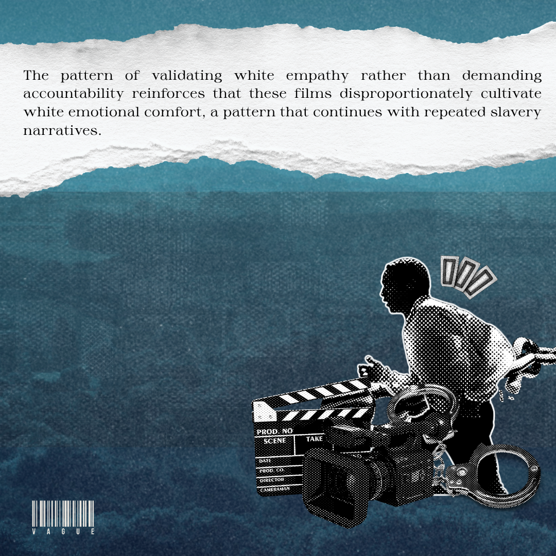For example, mainstream promotion and awards narratives around 12 Years a Slave foregrounded the white producers involved (such as Brad Pitt) and marketed the film as a triumph of artistry and conscience even as historical suffering remained the spectacle. The pattern of validating white empathy rather than demanding accountability reinforces that these films disproportionately cultivate white emotional comfort, a pattern that continues with repeated slavery narratives.