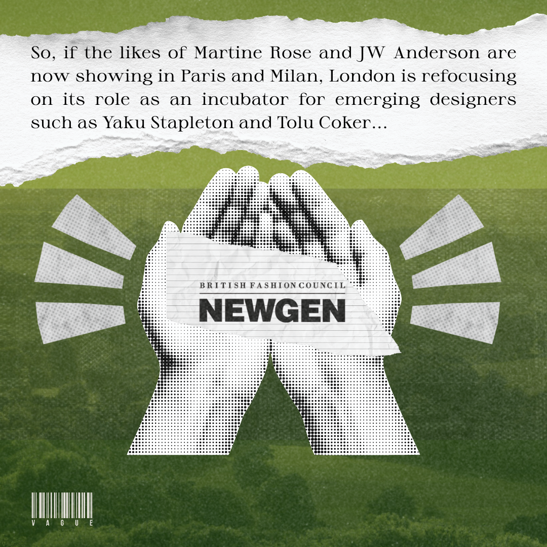 £2 million has been invested in the well-established NEWGEN programme — once backed by European ERDF subsidies — which aims to provide “the best emerging fashion design talent” with showcasing opportunities, mentoring, and grants. So, if the likes of Martine Rose and JW Anderson are now showing in Paris and Milan, London is refocusing on its role as an incubator for emerging designers such as Yaku Stapleton and Tolu Coker: personal, raw storytelling that feels distinctly of the British capital.