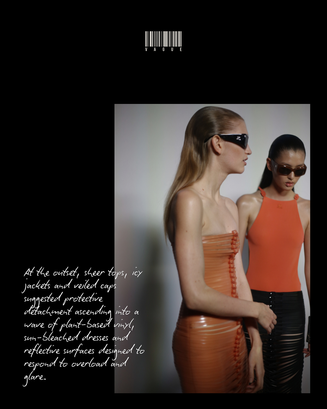 From a frosty teal opening to the molten peach, sand and dune tones that followed, the collection played out like a thermal gradient. At the outset, sheer tops, icy jackets and veiled caps suggested protective detachment ascending into an inferno of plant-based vinyl, sun-bleached dresses and reflective surfaces designed to respond to overload and glare. The accessories stayed on theme: face-covering visors, mutated bags, glove-like boots and transparencies that painted the picture of a future tinged by global warming.