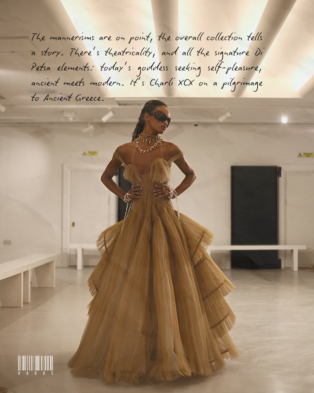 There was however, something missing from this collection that gave me pause. A piece of the ancient mosaic that could have made it all the more memorable. The mannerisms are on point, the overall collection tells a story. There’s theatricality, and all the signature Di Petsa elements: today’s goddess seeking self-pleasure, ancient meets modern. It’s Charli XCX on a pilgrimage to Ancient Greece.